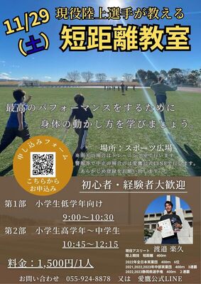 短距離教室開催!明日(11月28日)に、愛鷹広域公園多目的広場で陸上教室が開催されるって。引用元はこちら↓走りが変わる日になるかもしれません!!!···